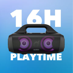 Pump up the volume with the Soundcore Select Pro Bluetooth Speaker. Powerful stereo sound with BassUp technology fills the room with sound, even in the great outdoors. Built-in LEDs blink in time to the beat to create a fun light show. With up to 16 hours of playtime, the party can keep going all night long. And, with an IPX7 waterproof rating, you can even take the party poolside.